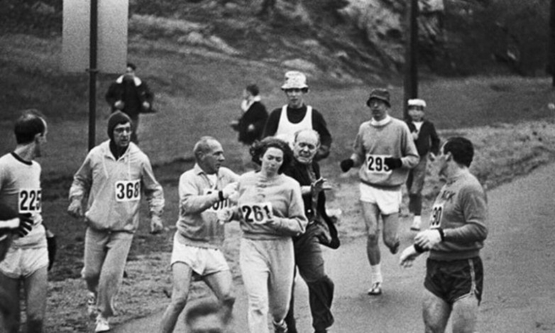Организаторы Бостонского марафона пытаются остановить Катрин Свитцер. Она стала первой женщиной, пробежавшей этот марафон, 1967