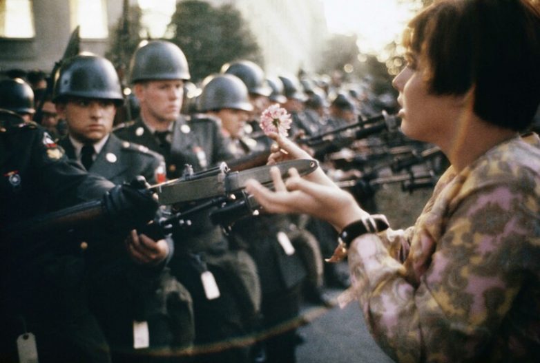 На нем запечатлен протест против военных действий во Вьетнаме и смелая девушка, вкладывающая цветок прямо в дуло оружия.