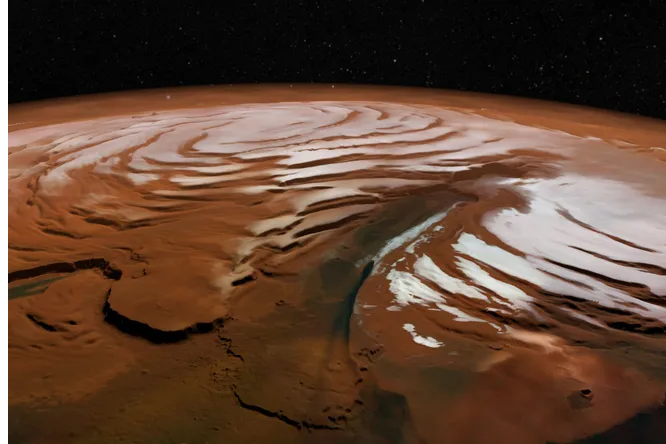 Два новых исследования показали, что может скрывать под собой ледяная шапка южного полюса Марса.