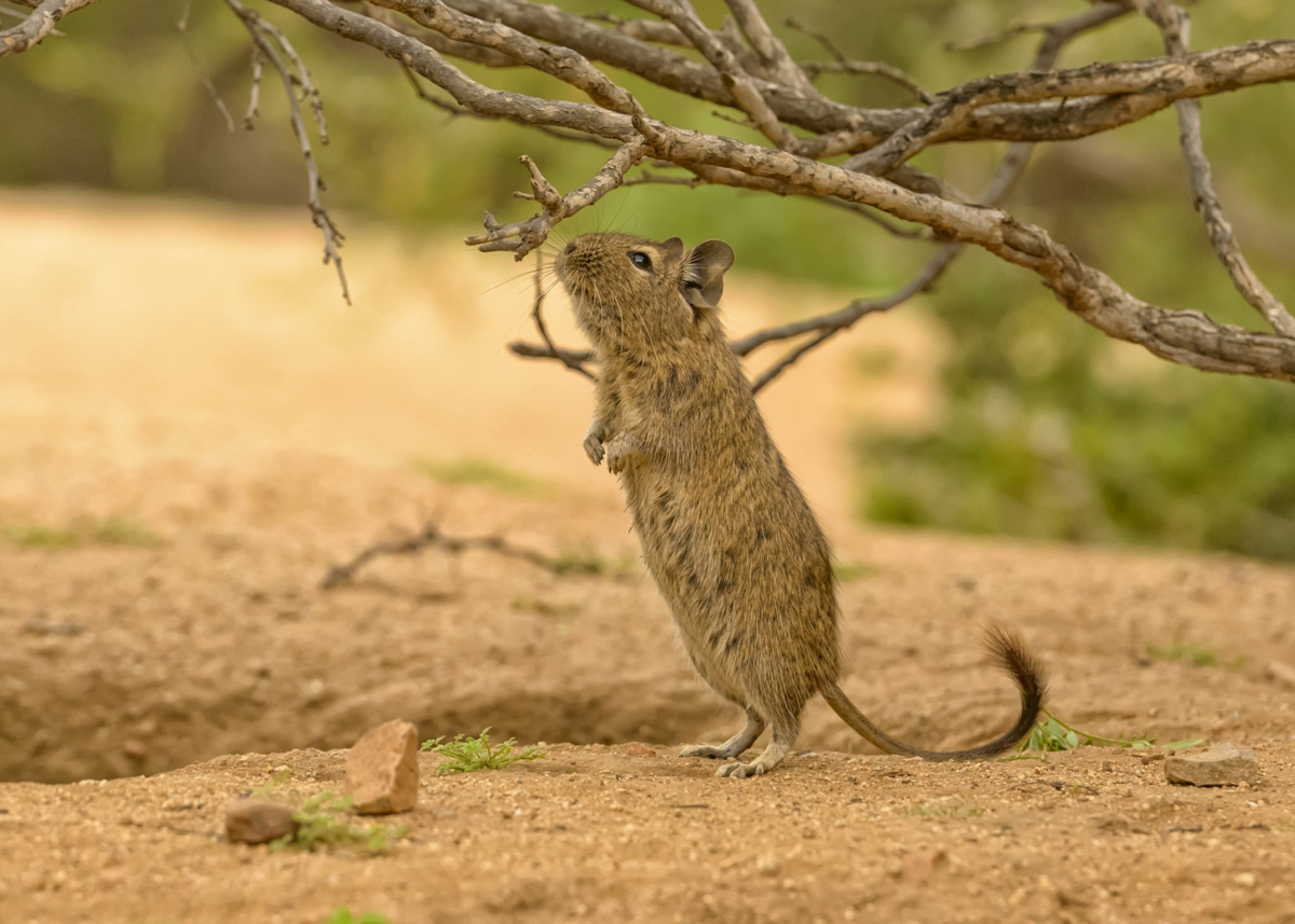 Так организм чилийской белки встал на перепутье: испарять воду он больше не способен, так как адекватной терморегуляции нема. Теперь во время жары грызун может свалиться замертво от перегрева. Но и воду взять неоткуда, чтобы потеть в своё удовольствие. Что же делать? Копать! В полуденный зной дегу прячутся в самодельных норах. Хотя, норы — это слабо сказано. Животины сооружают полноценные бункеры с ходами, камерами и выходами, где и проводят самую жаркую часть дня.