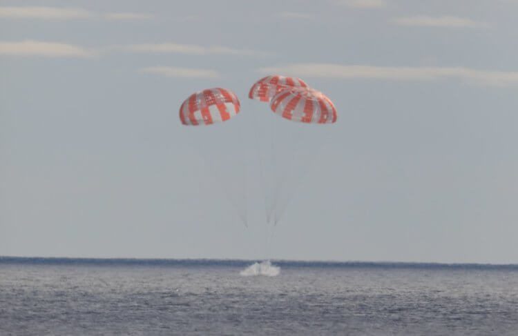 Космический корабль «Орион» опускается на воду при помощи трех парашютов