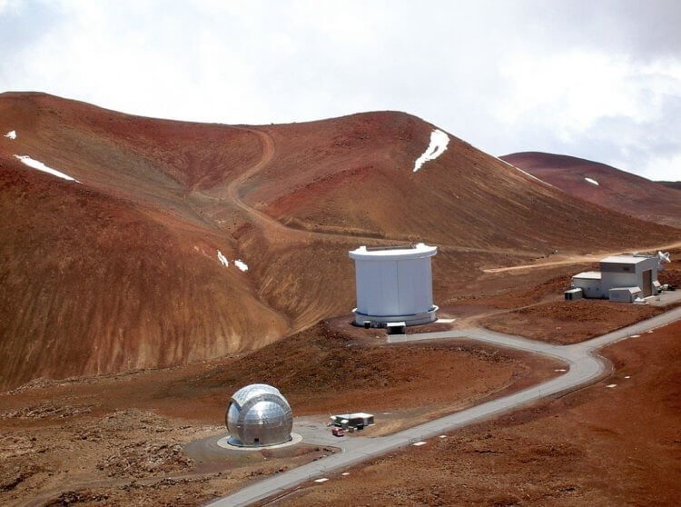 Шарообразный купол — помещение 10-метрового субмиллиметрового телескопа; Цилиндрическое строение — башня «Максвелла»