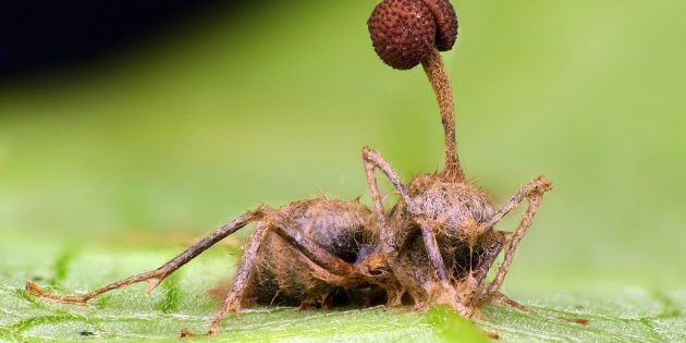 Затем кордицепс выращивает у муравья на голове плодовое тело и убивает насекомое. Так оно и висит, орошая спорами всё вокруг. Муравьи, впрочем, не дураки. Кладбищ, заваленных трупами поражённых грибком товарищей, они всеми силами стараются избегать.