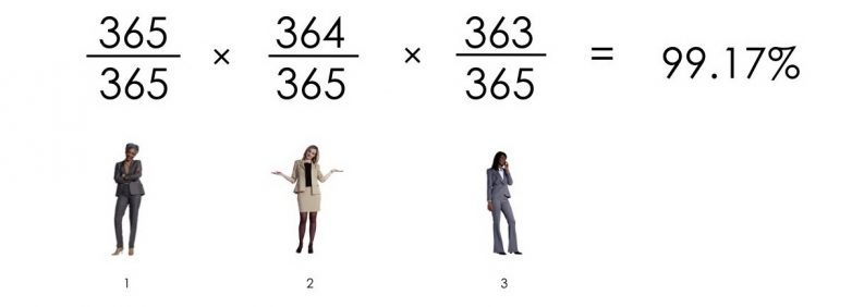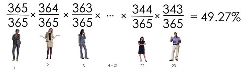 Давайте вернёмся к 23 коллегам из офиса, чтобы понять, как это возможно.Сформулируем обратное утверждение: не у двух человек в группе совпадут дни рождения.Выяснить вероятность того, что, по крайней мере, два человека в офисе справляют день рождения в один день, весьма затруднительно, если непосредственно столкнуться с этим.Выяснить вероятность того, что ни у кого в группе не совпадают дни рождения, намного легче.
