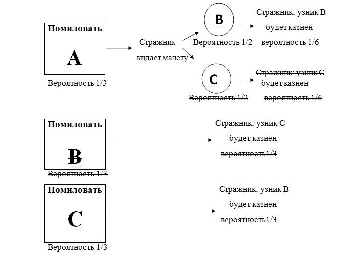 3) Итак, вероятность А быть помилованным остаётся неименной – 1/3, в то время как вероятность С быть помилованным увеличивается до 2/3.