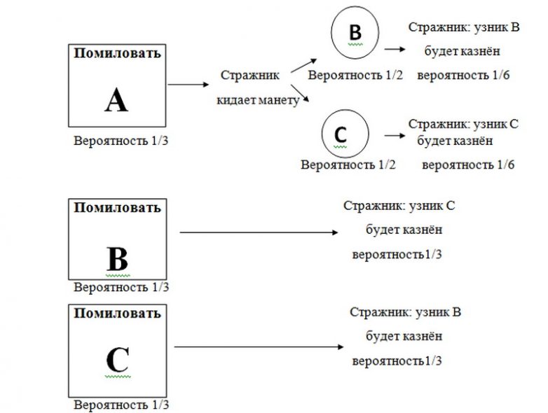 А если взглянуть на пример, где стражник сообщает, что узник В будет казнён, мы увидим, что узник С имеет в два раза больше шансов быть помилованным, чем узник А: