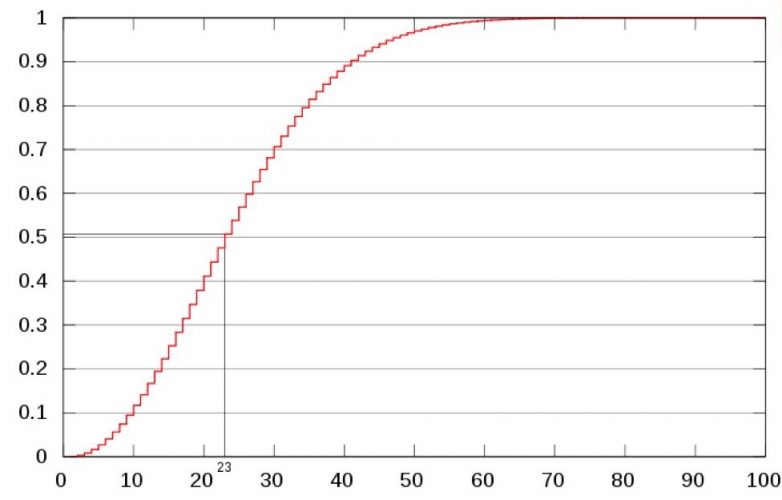 Предположим, вы работаете в офисе, где трудятся 23 работника, включая вас. Какова вероятность того, что у двоих сотрудников в офисе совпадут дни рождения? (Мы не берём во внимание 29 февраля)