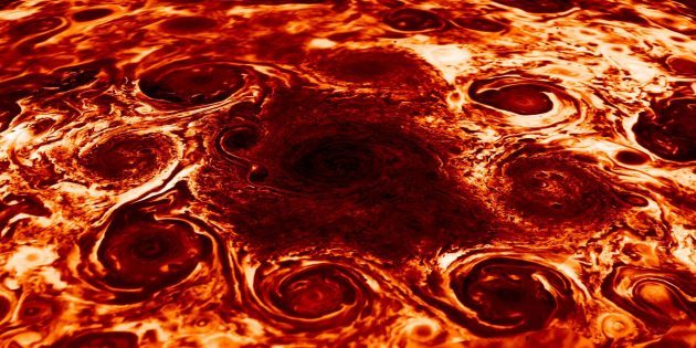 Сатурн не единственный газовый гигант с таким странным погодным явлением. Например, вокруг полюсов Юпитера постоянно возникают не столь большие, но более многочисленные шестиугольные бури, напоминающие соты.