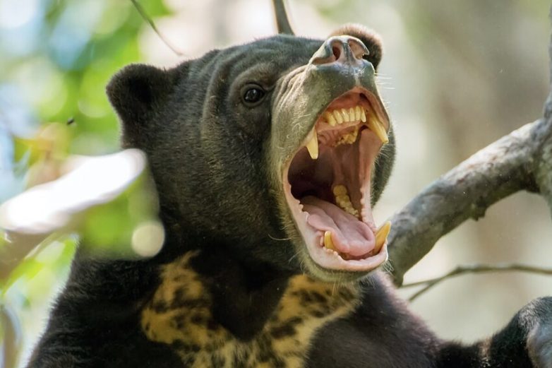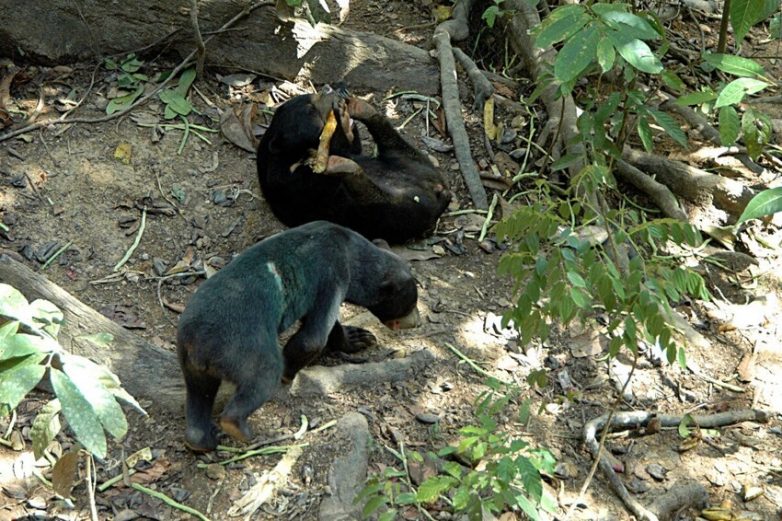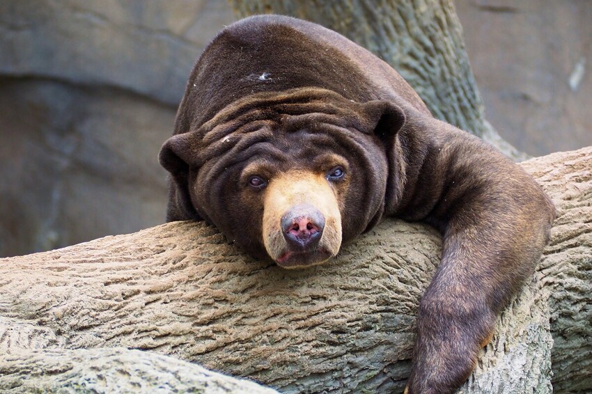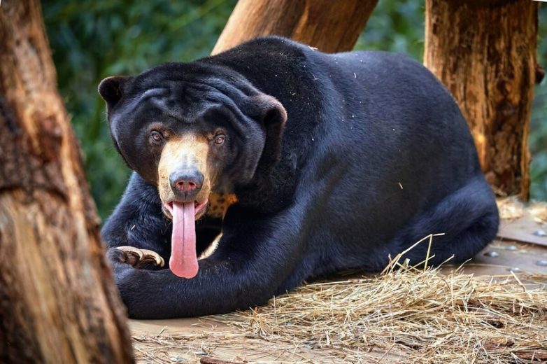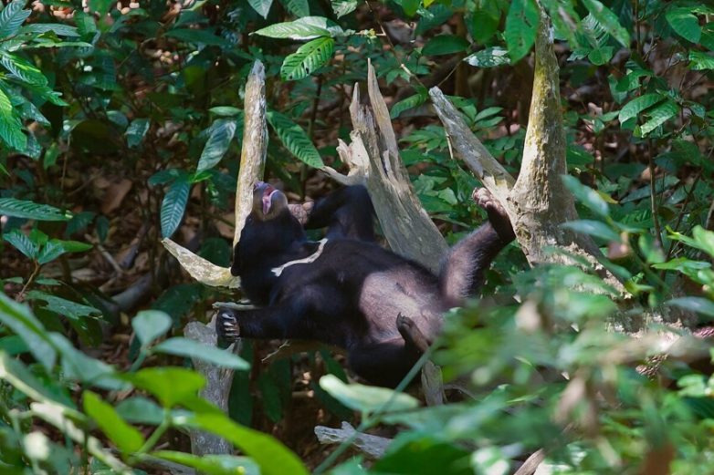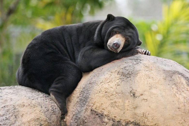 Аборигены как-то назвали малайца солнечным медведем, так и закрепилось. Во-первых, пятно на его шее очень похоже на закат небесного светила. А во-вторых, этот парень любит греть свои косточки под ультрафиолетовой лампой естественного происхождения. Чтобы избежать неприятностей, медведь забирается на высоту от 6 до 12 м и приступает к процедурам, сияя как то самое солнце.