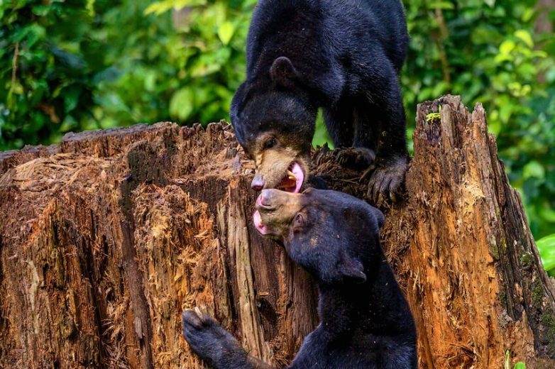 Малайские медведи — прекрасные пародисты. Сначала они имитируют мимику и повадки матери, затем начинают активно передразнивать друг друга. Навык пригодится им «в быту». При внезапном нападении супостата, «малаец» может зеркалить действия, чем введёт врага в состояние ступора. Желание повторять у них не отпадает даже в зоопарке, что только прибавляет «самопровозглашённым приматам» популярности.