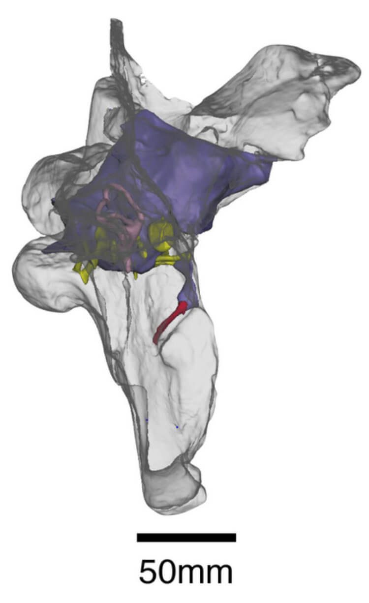Чтобы воссоздать мозг спинозавра, ученые провели его череп через компьютерный томограф. Изучив полученные снимки, исследователи смогли получить представление об эндокасте — рельефе внутренней части головы. Прикинув, в какой части головы располагались ответственные за разные задачи области мозга, ученые получили представление об особенностях мышления спинозавров.