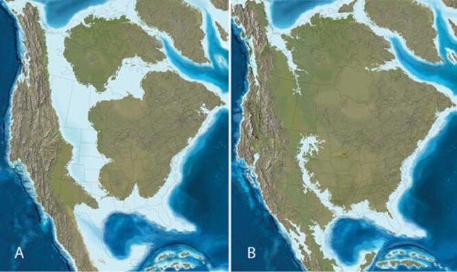 С середины до конца мелового периода (100-66 млн. лет назад) Северная Америка была разделена эпиконтинентальным морем, образовавшимся в результате понижения рельефа дна мирового океана. Тектоническая активность в конце мелового периода заставила острова сойтись, сформировав континент, который мы знаем по сей день.