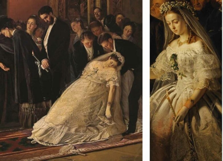Слева фрагмент картины «Прерванное венчание (Двоеженец)» (1877 год), справа — невеста с картины «Неравный брак» (1862 год). Вообще говоря, за пятнадцать лет уже и мода на форму кринолина поменялась, но художник почему-то не стал искать новую натуру, а написал совершенно прежнюю невесту.