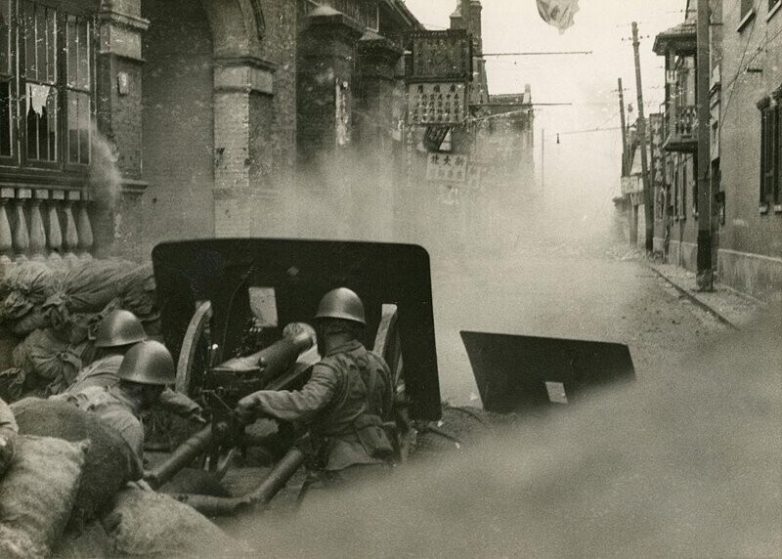 Солдаты ВМС Японии ведут перестрелку с национальными силами Китая на Северном железнодорожном вокзале Шанхая, сентябрь 1937 года.