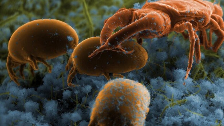 Дальние родичи пауков, размером примерно в 0,1 миллиметра, занимают нишу стадных травоядных. Поедая сброшенные нами частички, они превращают их в удобрения, на которых буйным цветом разрастаются колонии бактерий. Ими питаются уже другие виды клещей. Ну а возглавляет пищевую цепь клещи-хищники. Они поедают всех вышеперечисленных.