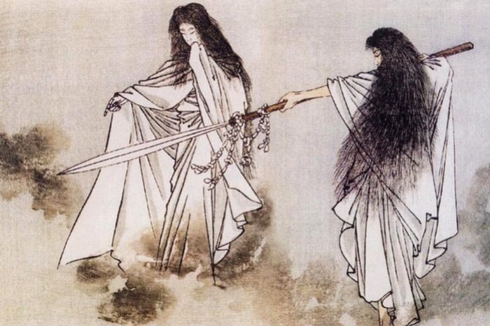 Древняя гравюра с мифологическим сюжетом, где, судя по всему, изображено копье хоко
