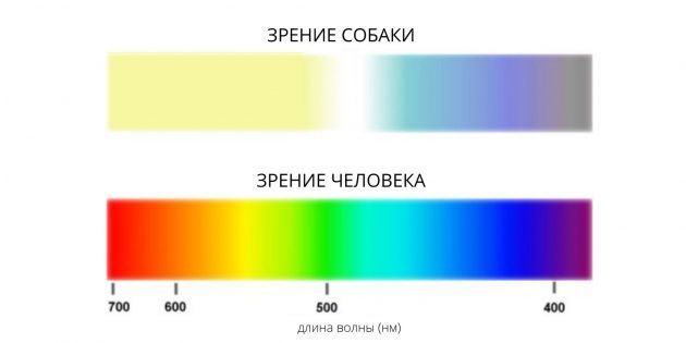 Считается, что собаки не способны различать цвета. Но это не так. Эти животные видят мир преимущественно в оттенках жёлтого, синего и серого и при этом не умеют различать красный и зелёный.