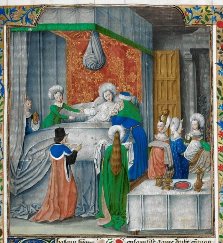 В средние века женщины высших классов общества закрывались в специальной комнате за несколько дней до родов. К ним пускали только женщин, а также тщательно закрывали окна шторами, чтобы свет не повредил глаза будущей матери