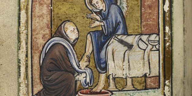 Святой Катберт омывает ноги ангелу, явившемуся ему в образе странника. Рукопись «Житие святого Катберта», XII век