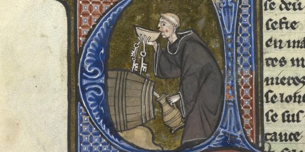 Монах пробует вино из бочки. Иллюминированная рукопись XIII века н. э., Британская библиотека