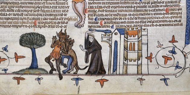 Монах бьёт демона дубинкой. Маргиналия из рукописи XV века