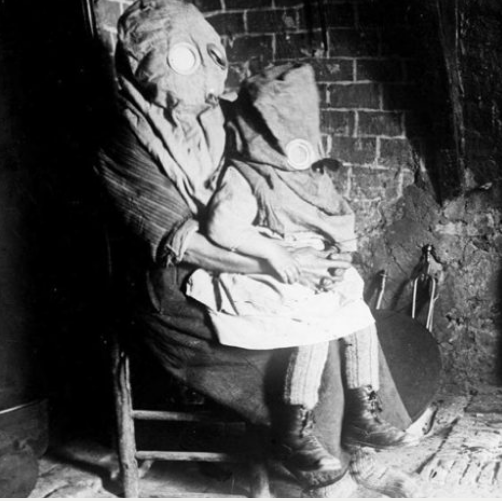 Мать с ребёнком готовят еду в противогазах. Французская глубинка, Первая мировая война.