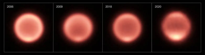 Обычно средняя температура планеты составляет -220°С, но за последние два года исследований обнаружилась, что температура полюса поднялась с -121°С до -110°С. При этом зона в районе экватора успела заметно остыть, что видно по более тёмному цвету в инфракрасном излучении.