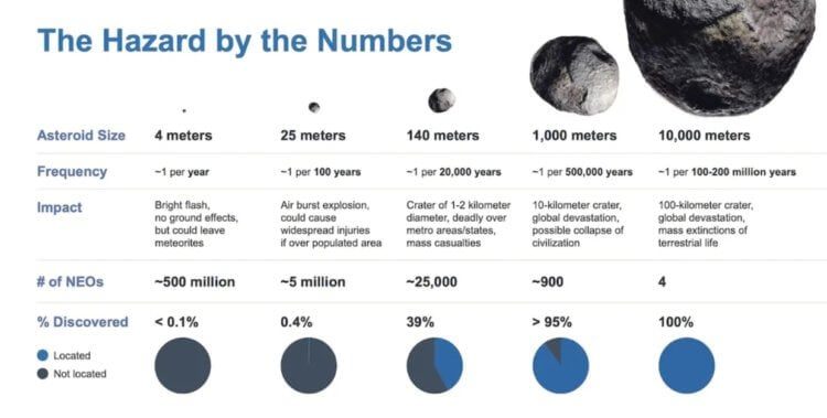 На сегодняшний день астрономы открыли 95% астероидов диаметром более одного километра. Поиски остальных 5% ведутся — иногда они обнаруживаются в самый неожиданный момент.Опасность астероидов оценивается по туринской шкале, которая также известна как шкала Торино. В ней используются значения от 0 до 10, где ноль означает полную безвредность наблюдаемого космического объекта, а десять — это неизбежное столкновение с последующей катастрофой. Чтобы дать оценку, ученые учитывают математическую вероятность столкновения и кинетическую энергию соударения.
