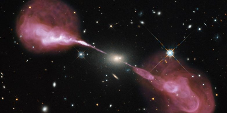 Учёные предполагают, что струи внутри галактики создаёт сверхмассивная чёрная дыра, когда поглощает материю из гигантского диска вокруг себя. При этом часть материи, которая закручивается спиралью с основанием в центре дыры, оказывается за горизонтом событий и может выбрасываться в космос в виде струй ионизированной плазмы со скоростью, близкой к скорости света. Они образуют лепестки, которые постепенно увеличиваются, и протяжённость Алкионея растёт.
