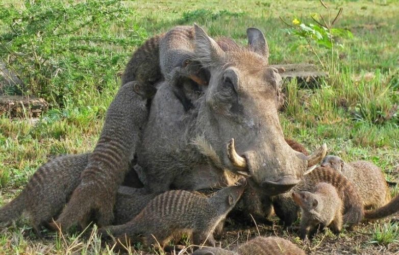 Бородавочник всегда рад только одному существу — полосатому мангусту. Реальный Тимон совсем не похож на героя культового мультфильма, он даже не сурикат! Дружба выгодна для обоих животин — Тимоны спасают Пумб от паразитов, а Пумбы защищают Тимонов от мелких хищников.