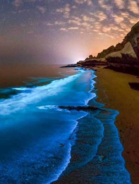 Пляжи и океанские побережья сами по себе живописные и красивые, однако когда на песок накатывают светящиеся волны, это выглядит особенно завораживающе. Этот уникальный феномен называется биолюминесценция, а появляется он благодаря миллионам особей нескольких видов фитопланктона, которые обладают способностью к выделению неонового света. В зависимости от вида, цвет освещения воды может меняться, но самым распространенным оказывается синий оттенок.