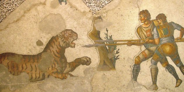 Гладиаторы сражаются с тигром. Мозаика V века в Большом Константинопольском дворце