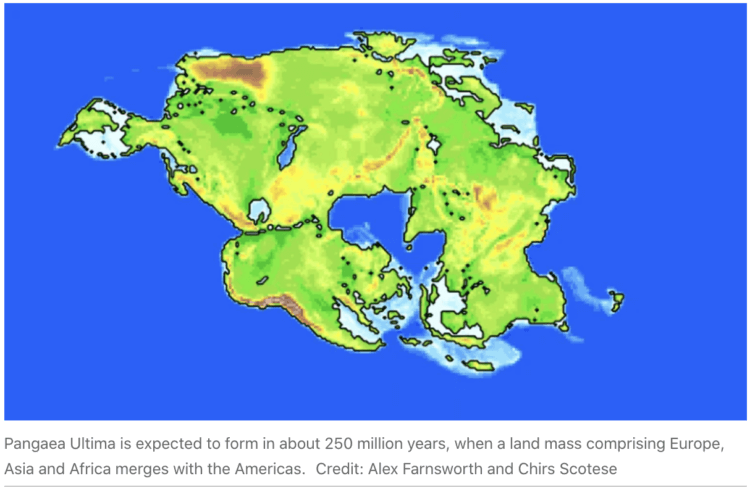 Результаты исследования, опубликованного в конце сентября в журнале Nature Communications, предсказывают массовое вымирание млекопитающих из-за экстремальной жары и образования суперконтинента Пангеи Ультима (Pangaea Ultima) через 250 миллионов лет.