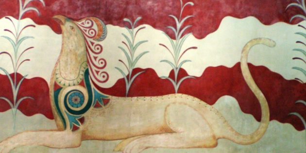 Восстановленная фреска бронзового века с изображением грифона в тронном зале Кносского дворца, Крит