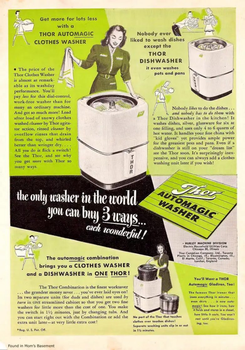 В 1907 году чикагская компания Hurley Electric Laundry Equipment Company представила первую электрическую стиральную машину, предназначенную для потребительского рынка в Соединенных Штатах. А в 40-х годах XX века появился странный, но вполне рабочий гибрид стиральной и посудомоечной машины.