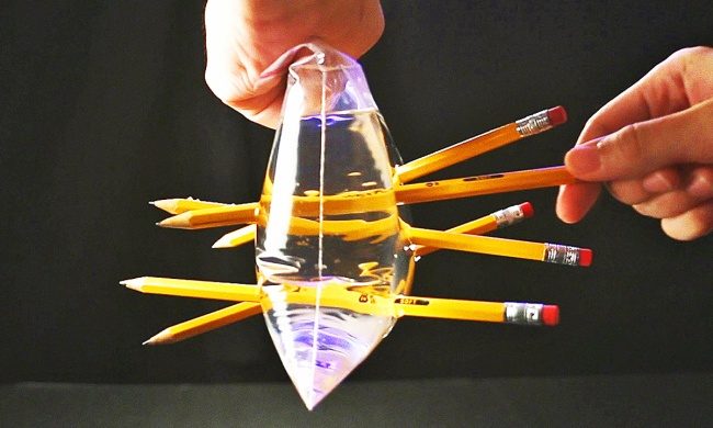 Объяснение: Если полиэтиленовый пакет проткнуть и потом залить в него воду, она будет выливаться через отверстия. Но если пакет сначала наполнить водой наполовину и затем проткнуть его острым предметом так, что бы предмет остался воткнутым в пакет, то вода вытекать через эти отверстия почти не будет. Это связано с тем, что при разрыве полиэтилена его молекулы притягиваются ближе друг к другу. В нашем случае, полиэтилен затягивается вокруг карандашей.
