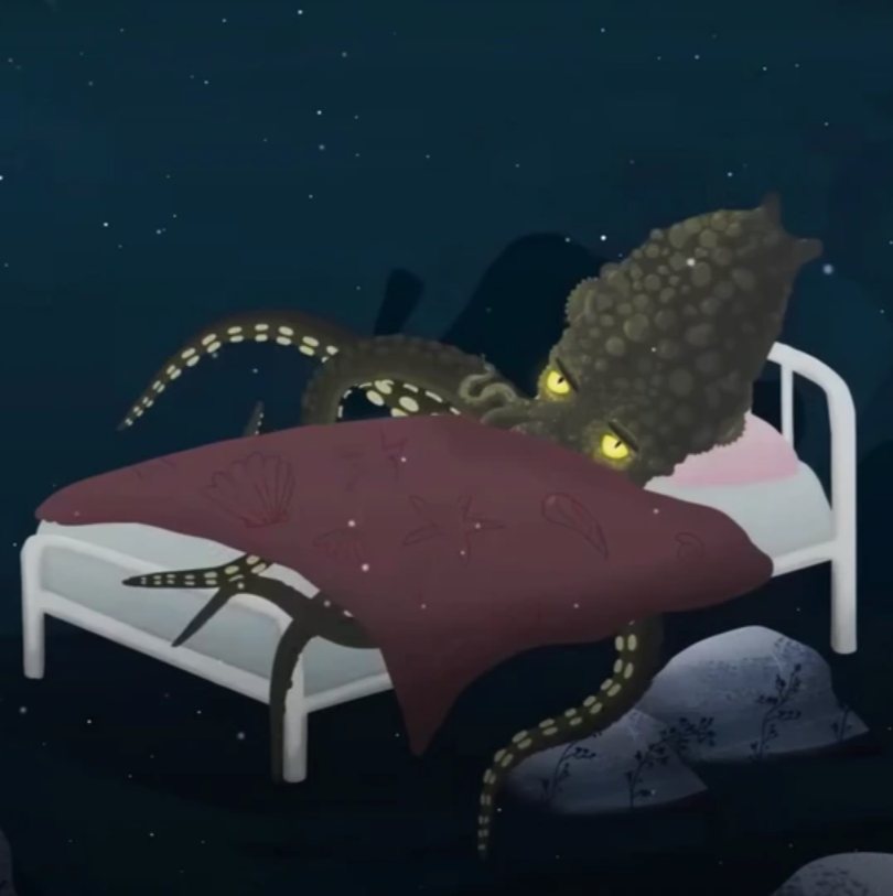 Люди на борту заметили вас и запустили сигнальную ракету. Вас ослепил яркий красный свет. Вы расправили щупальца и ненароком толкнули корабль. Он тяжелый, поэтому не перевернулся. Похоже, технологии сильно развились, пока вы спали. Гроза усиливается. Судно качает из стороны в сторону. Вы пытаетесь удержать его с помощью щупальцев, но это пугает людей на борту. Они кричат — их реакция вам понятна. Гигантское чудовище вышло из черных глубин и схватило их корабль. Неприятно видеть, что они вас боятся, поэтому вы решаете уплыть. Оскорбленный, вы прячетесь на дне океана.