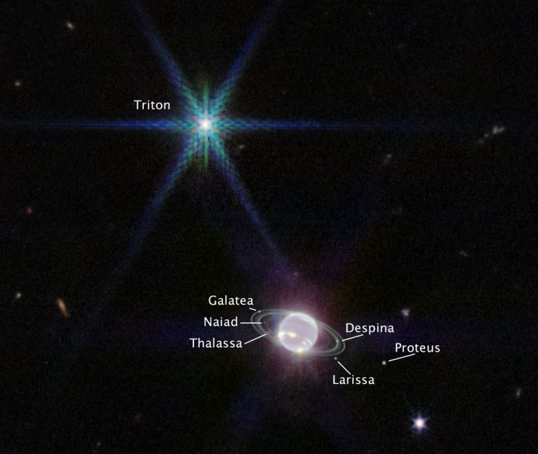 Также на фото удалось запечатлеть 7 из 14 нептуновых лун. NASA даже предоставило расшифровку, где что находится: