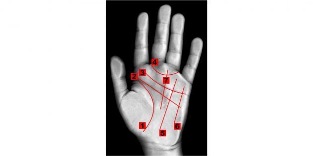 Расположение линий на руке согласно хиромантским воззрениям: 1. Линия жизни. 2. Линия головы. 3. Линия сердца. 4. Кольцо Венеры. 5. Линия Солнца. 6. Линия Меркурия. 7. Линия удачи