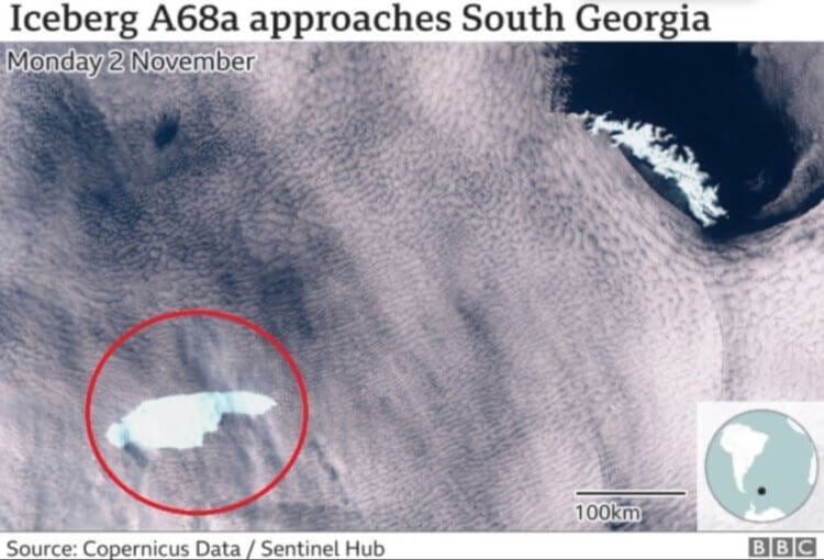 На протяжении многих лет, рекорд величины принадлежал айсбергу А-68. В 2020 году его площадь составляла 4 200 квадратных километров, то есть он был в два раза больше Москвы. Он откололся от шельфового ледника Ларсена, а потом начал плыть в сторону британского острова Южная Георгия. В середине декабря 2020 года глыба льда разделилась на две части, а спустя несколько недель ученые заметили четыре фрагмента. Спутниковые снимки 2021 года вовсе показали, что айсберг A-68 был разделен на 11 крупных и множество мелких частей, то есть он уже не является самым большим в мире.