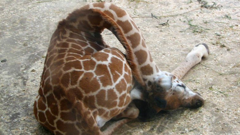 Пожалуй, один из самых интересных вопросов — это как спят жирафы? Действительно, на первый взгляд, с такой длинной шеей устроиться на отдых довольно проблематично. Но, у природы всё продумано. Жирафы спят согнув шею, так, что голова на нижней части задней конечности. Весь процесс укладывания занимает 15-20 секунд. Сначала жирафы опускаются на грудь, а затем на живот. Интересно, что спят жирафы лишь по несколько минут подряд. Продолжительность глубокого сна за ночь не превышает 20 минут.