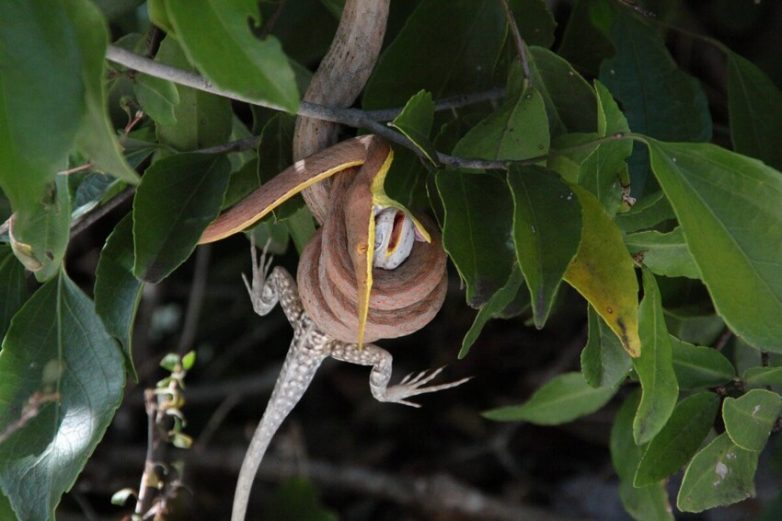Однако, несмотря на вооружение, ни в какие поединки наши друзья не ввязываются. Заползут себе куда-нибудь на ветки, не шибко высоко, свесятся вниз головой и висят, как какие-нибудь стручки. И вот так почти 22 часа в сутки. Как показывает практика, такой образ жизни идёт рептилии на пользу. Ведь змее не нужно искать добычу, она сама ищет охотницу!