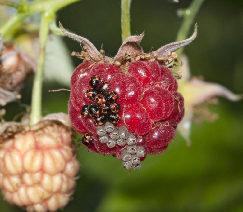 Но в мае-июне клопы делают самую гадкую гадость. На реверсе листьев или прямо на ягодах они оставляют аккуратные кладки с яйцами. Особенно грустная ситуация с малиной — яйца ягодников очень похожи на подгнившие сегменты. Их можно даже не заметить.