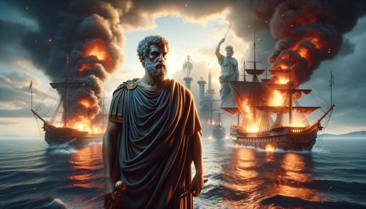 Но до того, лучники с кораблей на такой дистанции наверняка могли поразить стрелами многих греческих воинов, управлявшими зеркалами.