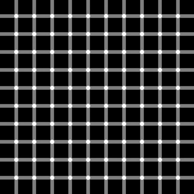 На пересечениях всех белых полос, за исключением того пересечения, на котором вы фиксируете взгляд в данный момент, видны маленькие черные пятна, которых на самом деле нет.