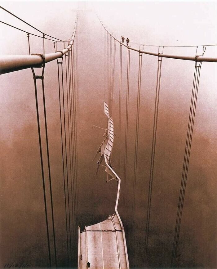 Вид на обрушившийся моста через пролив Такома с подвесной кабельной системы, 1940