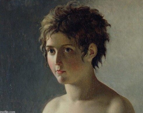 Прическа «а-ля Тит» — короткая стрижка, которая стала популярной во время Французской революции. Вдохновением для нее послужило то, как палачи обрезали волосы жертвам перед гильотиной. Красная лента на шее — еще один символ этого вида казни