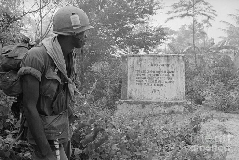 1970 год, чернокожий американский солдат читает послание, оставленное Вьетконгом во время войны во Вьетнаме: «Чернокожие солдаты США! Вы совершаете в Южном Вьетнаме те же позорные преступления, которые клика Ку-Клукс-Клана совершает против ваших семей у вас дома».