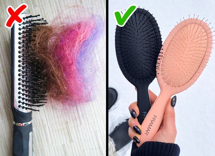 В результате запущенная расческа даже чистым локонам сможет придать жирности, отнять часть объема и прибавить ломкости. При этом страдает и кожа головы: появляются зуд, покраснения и даже перхоть. Поэтому лучше удалять все волоски с щетки после каждого использования и тщательно мыть ее раз в неделю.