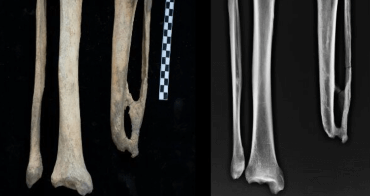 Один из скелетов возрастом 2500 лет с ампутированной ногой. Источник фото: nplus1.ru